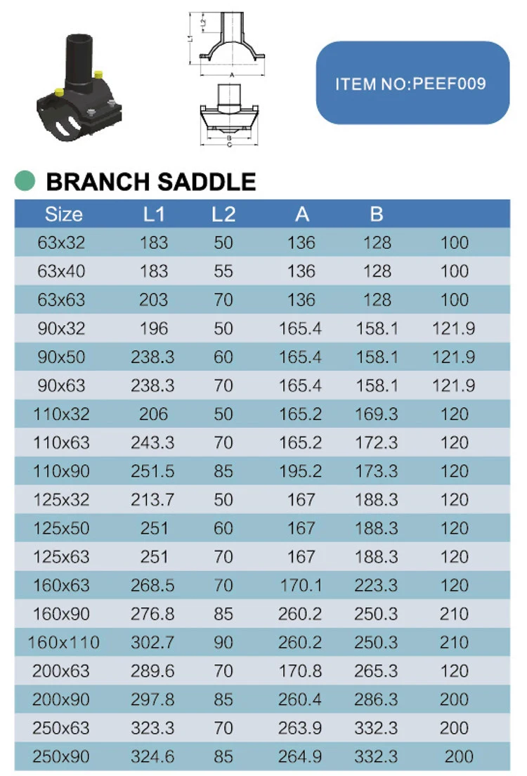 Branch Saddle HDPE Electrofusion PEEF009 thuộc nhóm phụ kiện hàn điện trở dùng cho hệ thống nước áp lực và khí đốt.